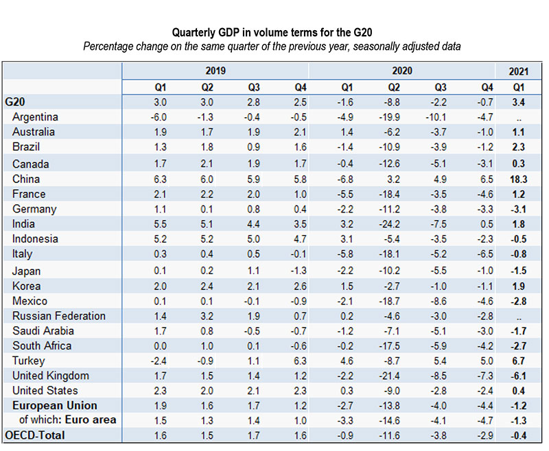Özündə ABŞ, Kanada, Almaniya, Fransa, Böyük Britaniya, Yaponiya, Cənubi Koreya kimi iqtisadi nəhənglər də daxil olmaqla 37 ölkəni birləşdirən İqtisadi Əməkdaşlıq və İnkişaf Təşkilatı (OECD) bugün G20 ölkələr qrupunun cari ilin birinci rübünə dair ÜDM göstəricilərini açıqlayıb.