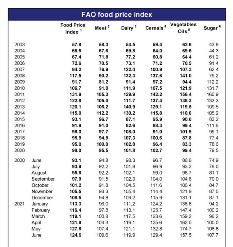Marja, Birləşmiş Millətlər Təşkilatına (BMT) daxil olan Ərzaq və Kənd Təsərrüfatı Təşkilatının (FAO) məlumatlarına istinadən xəbər verir ki, FAO Şəkər Qiyməti İndeksi 2021-ci ilin May ayı ilə müqayisədə İyun ayında 0,9% də artıb. İndeks ardıcıl üçüncü aydır yüksəlir.