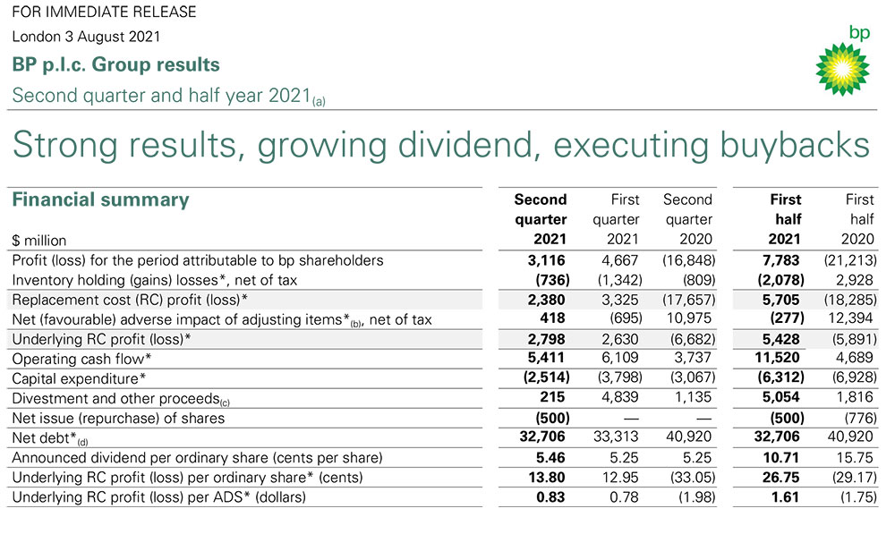 Böyük Britaniyanın neft-qaz şirkəti, dünyanın ən iri enerji nəhənglərindən biri BP (British Petroleum) 2021-ci ilin 2-ci rübünün və ilk yarısının maliyyə nəticələrini açıqlayıb.
