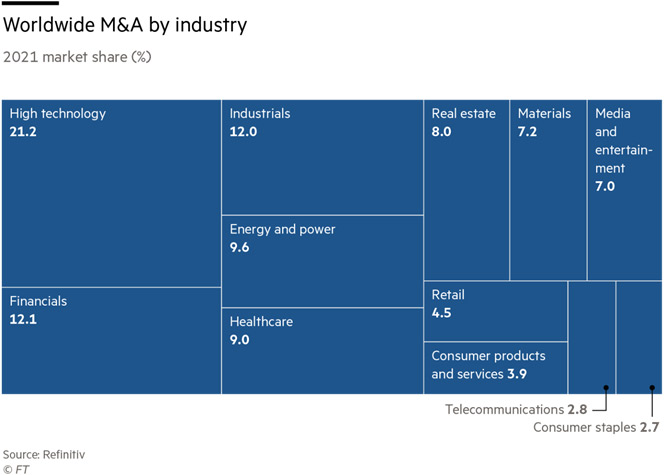 Texnologiya sektoru 21% payla liderlik edir - 8742 sövdələşmə, 832 milyard dollar (2019-cu ildə 291 milyard dollar, ötən il 301 milyard dollar). Digər iri sahələr maliyyə xidmətləri (12,1%), sənaye (12%), enerji və səhiyyədir (hər ikisi 9,6%).