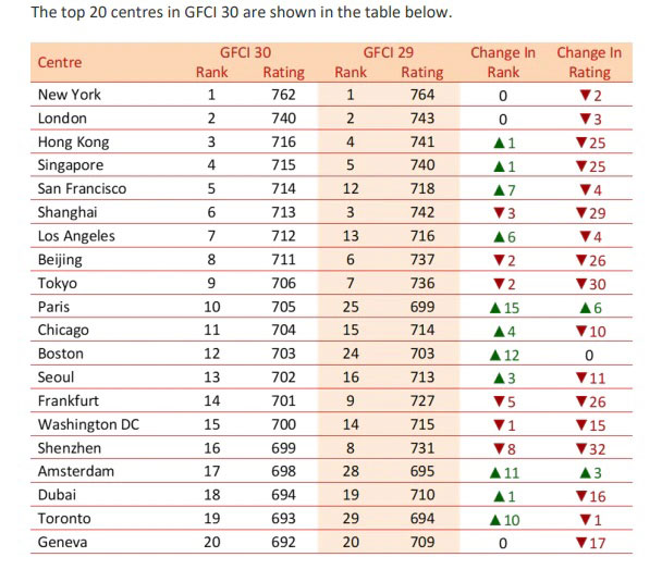 Kommersiya məqsədli konsaltinq, araşdırma (think-tank) və vençur kapital şirkəti Z/Yen Group-un Çin İnkişaf İnstitutu ilə birlikdə tərtib etdiyi indeksdə Nyu-York lider mövqeyini qoruyub saxlayır. Böyük Britaniyanın paytaxtı London Brexit-ə baxmayaraq, hələ də əsas qlobal maliyyə mərkəzlərindən biri olaraq 2-ci yerdə qərarlaşmağa davam edir.