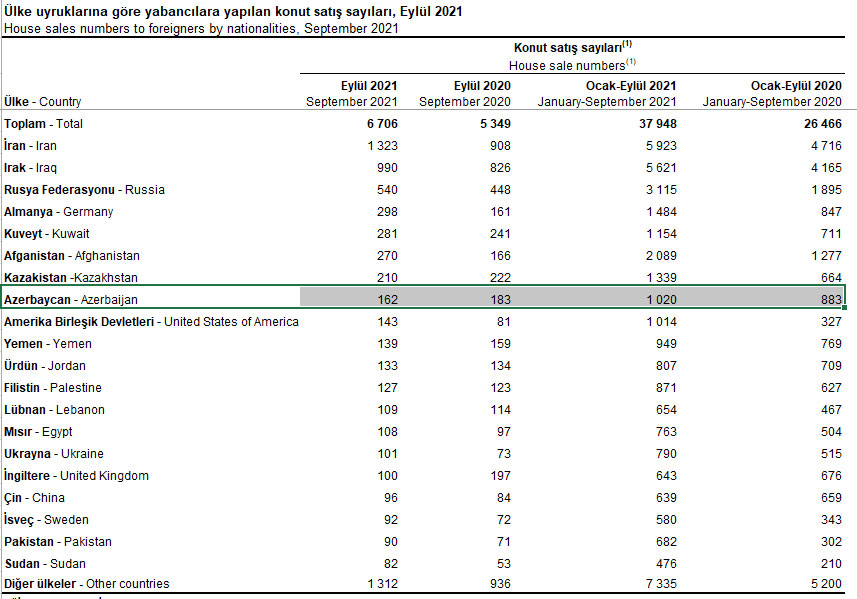 2021-ci ilin yanvar-sentyabr aylarında (9 ay ərzində) azərbaycanlılar Türkiyədə 1020 mənzil alıblar. 2020-cu ilin eyni dövründə azərbaycanlılar Türkiyədə 883 mənzil almışdılar. Təkcə avqustda azərbaycanlılar tərəfindən 162 mənzil alınıb.