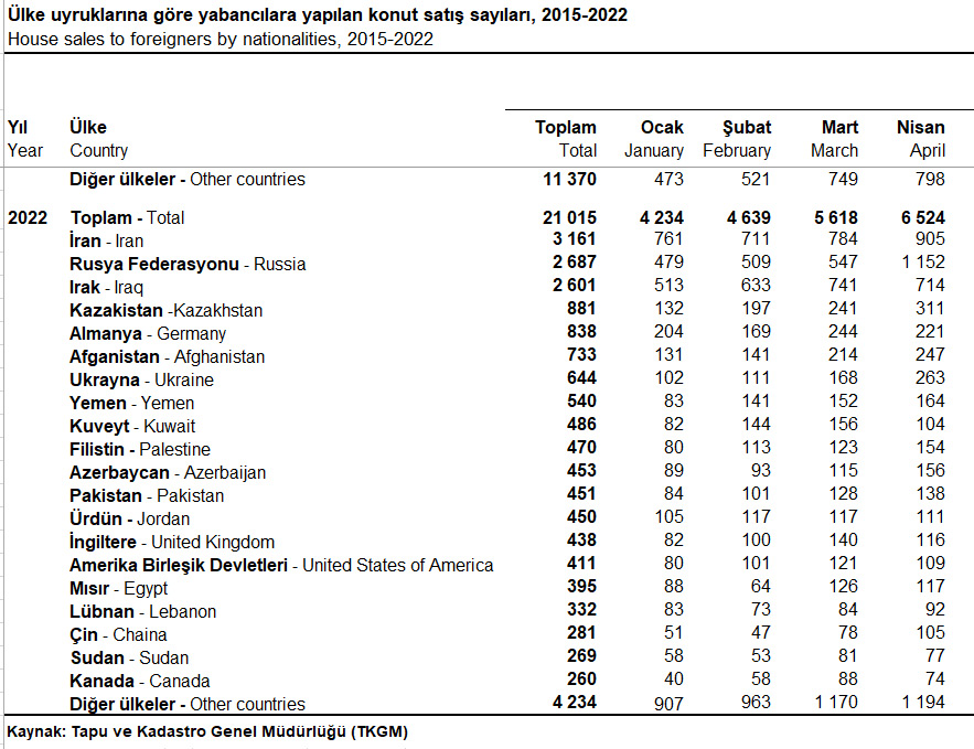 Aprel ayında Rusiya Federasiyası vətəndaşları Türkiyədən 1152 mənzil alıblar. Rusiya Federasiyası vətəndaşlarının ardınca 905 alış ilə İran və 714 alış ilə İraq vətəndaşları gəlir.