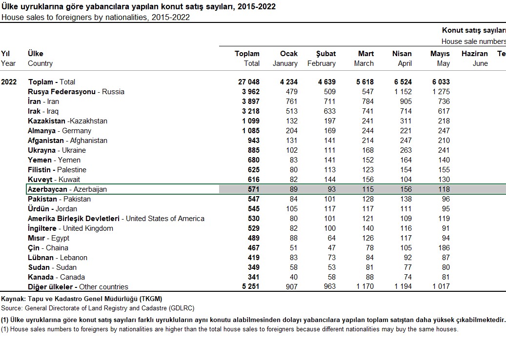 2022-ci ilin yanvar-may aylarında azərbaycanlılar Türkiyədə 571 mənzil (ev) alıblar.